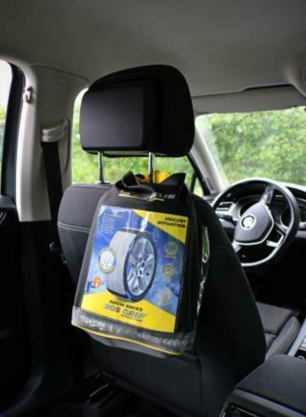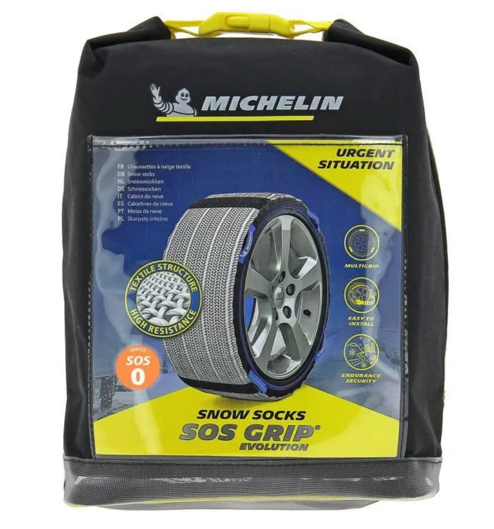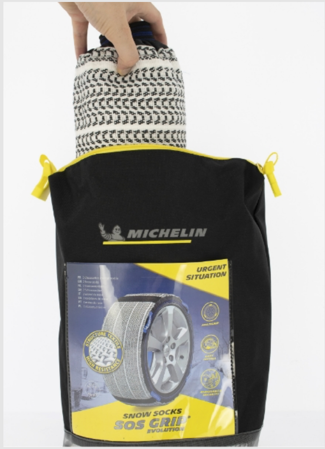 Sacoche de la gamme Michelin SOS Grip. Cette sacoche a été conçu pour offrir une praticité et une rapidité d’usage correspondant au positionnement d’urgence et d’appoint de ces chaussettes à neige